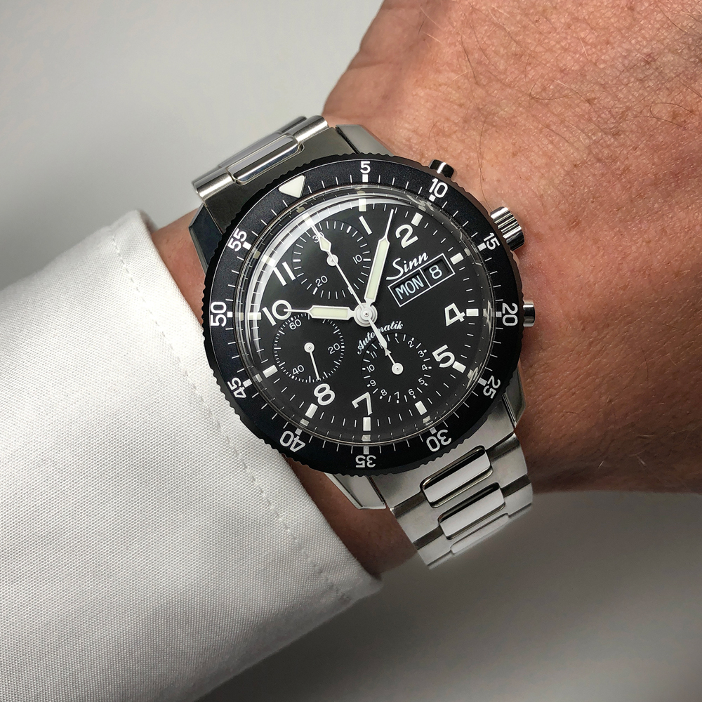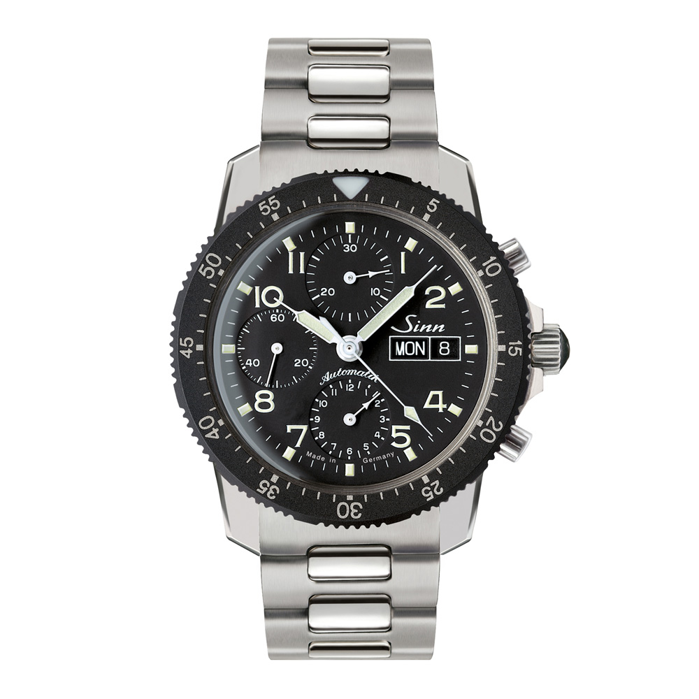 このモデルは、優れた視認性、刻時・計時精度を誇るシンプルなダイヤルを備えたシリーズの基本モデルに、60年代にドイツ空軍クロノグラフとして制式採用されたモデル155の伝統を踏襲した両方向回転式のブラックカラーベゼルを装備しています。ステンレススチール製のケース、ねじ込み式リューズ、ねじ込み式の裏蓋など必要最小限のスペックに、ドイツ軍に要求された強化アクリル製の風防を装備しています。強化アクリル製の風防は、時間のかかる風防交換を必要とせず、ポリッシュによって簡単に傷を落とすことができ、常に実戦に使用できるため指定されたスペックです。デザイン的にもクラシックな雰囲気を湛えたコストパフォーマンスの高いパイロットクロノグラフです。